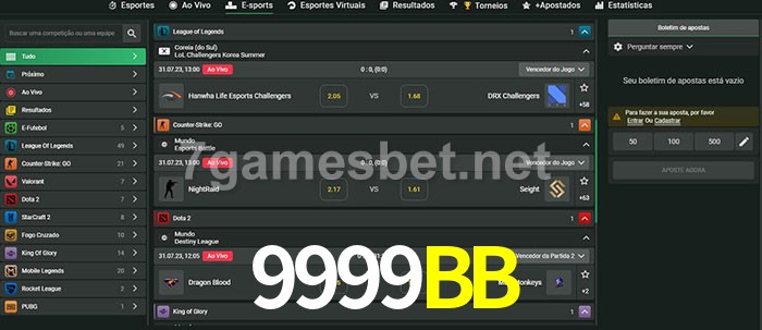 O 9999BB oferece uma grande seleção de opções de apostas em e-sports com probabilidades competitivas